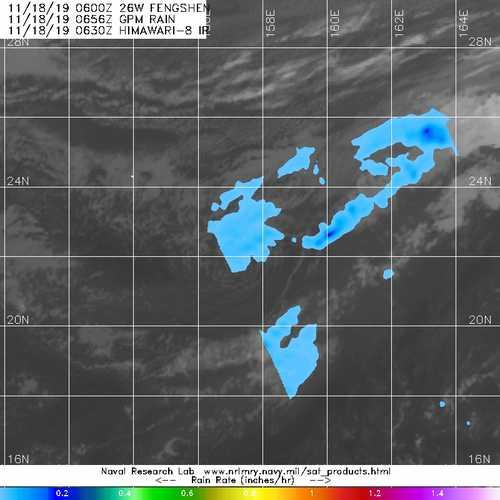image: The GPM core satellite passed over Tropical Depression Fengshen in the Northwestern Pacific Ocean on Nov. 18 at 1:56 a.m. EST (0656 UTC) and found a few areas of light rain (blue) falling at a rate of 0.4 inches (10 mm) per hour.