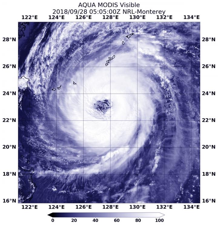 image: At 1:05 a.m. EDT (0505 UTC) on Sept. 28, the MODIS instrument aboard NASA's Aqua satellite provided a visible image of Typhoon Trami that revealed a clear eye and a powerful storm.