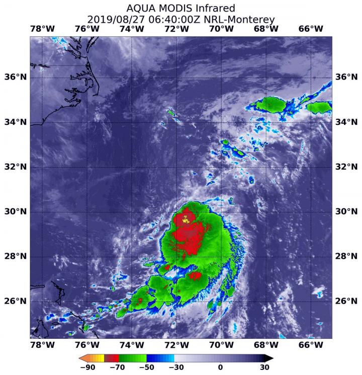 On August 27 at 2:40 a.m. EDT (0640 UTC), the Moderate Imaging Spectroradiometer or MODIS instrument that flies aboard NASA's Aqua satellite used infrared light to analyze the strength of storms within the depression. Tropical cyclones are made of up hundreds of thunderstorms, and infrared data can show where the strongest storms are located. They can do that because infrared data provides temperature information, and the strongest thunderstorms that reach highest into the atmosphere have the coldest cloud top temperatures.