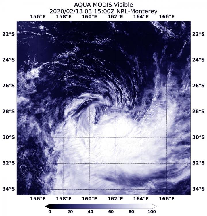 At 0300 UTC on Feb. 13 (10 p.m. EST on Feb. 12), the Joint Typhoon Warning Center (JTWC) issued the final bulletin on Tropical cyclone Uesi. At that time, Uesi was located near latitude 27.7 degrees south and longitude 161.1 degrees east, about 332 nautical miles southwest of Noumea, New Caledonia. Uesi had maximum sustained winds near 55 knots (63 mph/102 kph). The storm was moving to the south-southwest.