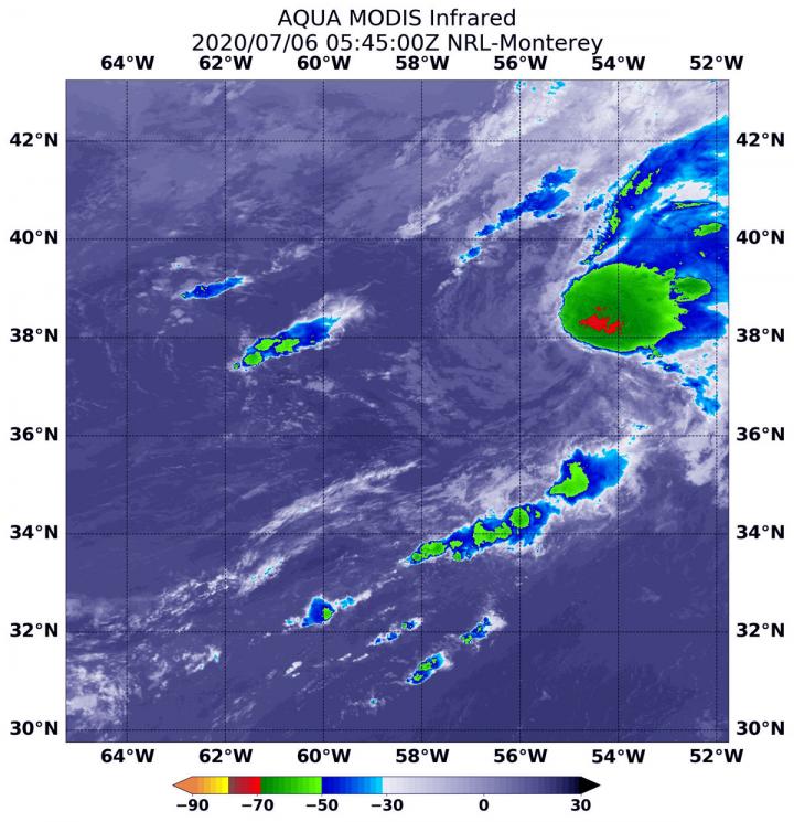 On July 6 at 1:45 a.m. EDT (0545 UTC), the MODIS instrument aboard NASA's Aqua satellite analyzed Tropical Storm Edouard's cloud tops in infrared light. Infrared data provides temperature information, and the strongest thunderstorms that reach high into the atmosphere have the coldest cloud top temperatures.