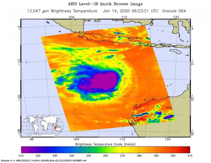 On Jan. 14 at 1:23 EST (0623 UTC) NASA's Aqua satellite analyzed the storm using the Atmospheric Infrared Sounder or AIRS instrument. AIRS found the coldest cloud top temperatures were getting warmer. That is an indication that the uplift of air in the storm is not as strong as it was before. AIRS found temperatures as cold as or colder than minus 63 degrees Fahrenheit (minus 53 degrees Celsius) around Claudia's center. NASA research has shown that cloud top temperatures that cold indicate strong storms that have the capability to create heavy rain.