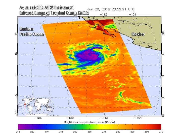 At NASA's Jet Propulsion Laboratory in Pasadena, California, infrared data taken of Emilia by the Atmospheric Infrared Sounder or AIRS instrument that flies aboard NASA's Aqua satellite was made into a false-colored infrared image. That data from June 28 at 4:59 p.m. EDT (2059 UTC) revealed powerful storms with very cold cloud top temperatures in excess of minus 63 degrees Fahrenheit (minus 53 degrees Celsius) around the center.
