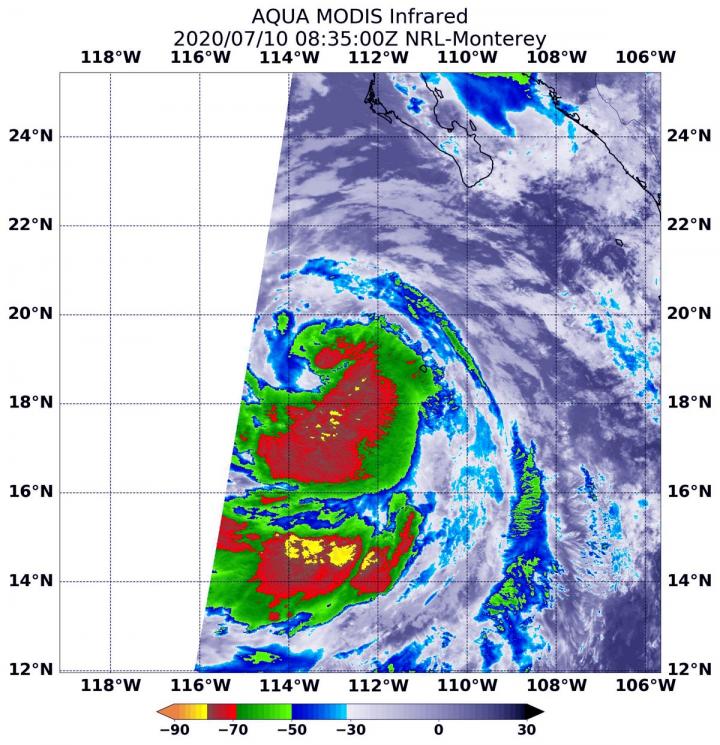 On July 10 at 4:35 a.m. EDT (0835 UTC), the MODIS instrument aboard NASA's Aqua satellite analyzed Tropical Storm Cristina's cloud tops in infrared light. Infrared data provides temperature information, and the strongest thunderstorms that reach high into the atmosphere have the coldest cloud top temperatures.