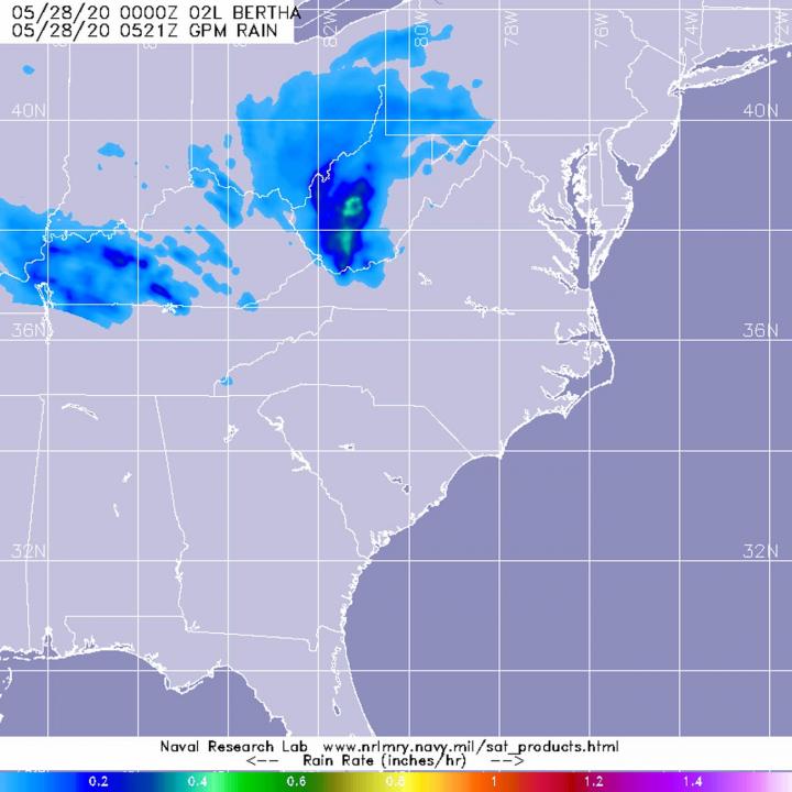 image: The GPM's core satellite passed over Bertha and analyzed its rainfall rates on May 28 at 1:21 a.m. EDT (0521UTC). GPM found heaviest rainfall over south central West Virginia, where rain was falling at rates of 1 inch (25 mm) per hour. A large area of light rain northwest of the center was falling at around 0.2 inches (less than 5 millimeters) per hour.