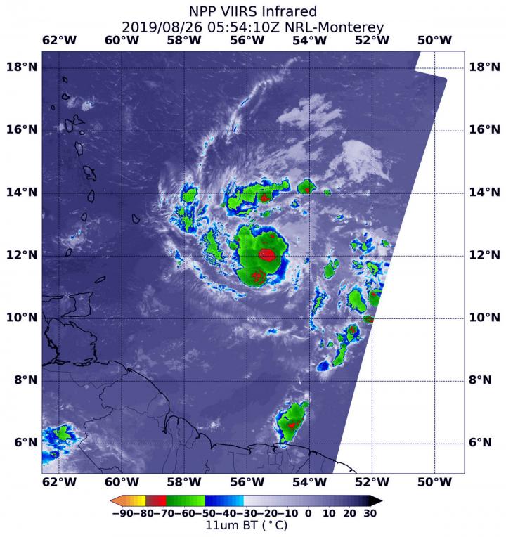 image: NASA-NOAA's Suomi NPP satellite passed over Tropical Storm Dorian in the western North Atlantic Ocean and the VIIRS instrument aboard captured this image of the storm on Aug. 26 at 1:54 a.m. EDT (0554 UTC). Coldest (red) cloud top temperatures were as cold as minus 70 degrees Fahrenheit (minus 56.6 Celsius).