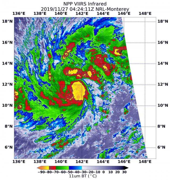 The Visible Infrared Imaging Radiometer Suite (VIIRS) instrument aboard Suomi NPP provided an infrared image of the storm on Nov. 27 at 0424 UTC (Nov. 26 at 11:24 p.m. EST). Infrared imagery reveals cloud top temperatures, and the higher the cloud top, the colder it is, and the stronger the storm.
