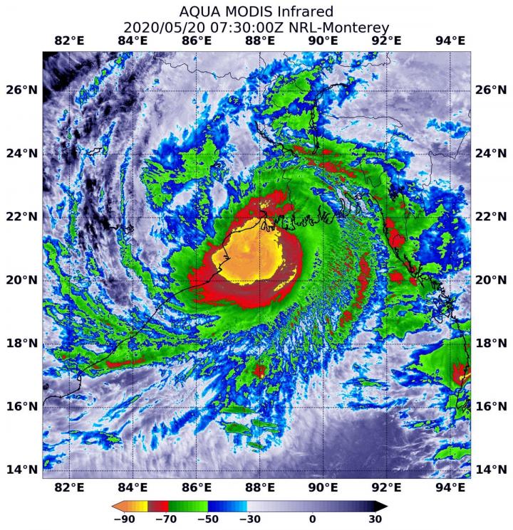 On May 20, 2020, at 3:30 a.m. EDT (0730 UTC) the Moderate Resolution Imaging Spectroradiometer or MODIS instrument and the Atmospheric Infrared Sounder or AIRS instrument that both fly aboard NASA's Aqua satellite found coldest cloud top temperatures in a large area around Amphan's center of circulation and along the coast on northeastern India. It was as cold as or colder than minus 80 degrees Fahrenheit (minus 62.2 Celsius). NASA research has found that cloud top temperatures that cold indicate strong storms with the potential to generate heavy rainfall.