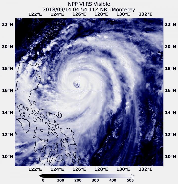 image: At 12:54 a.m. EDT (0454 UTC) on Sept. 14, the VIIRS instrument aboard NASA-NOAA's Suomi NPP satellite captured a visible image of Super Typhoon Mangkhut approaching the Philippines.