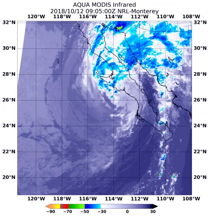 Infrared data provides temperature information. MODIS found strongest storms with coldest cloud top temperatures as cold as minus 63 degrees Fahrenheit (minus 53 Celsius) in a small area in northwestern Mexico. NASA research has shown that cloud tops with temperatures that cold were high in the troposphere and have the ability to generate heavy rain. A large area of storms with cloud top temperatures near minus 50 degrees Fahrenheit blanketed most of Baja California, northwestern mainland Mexico and stretched into southern Arizona.