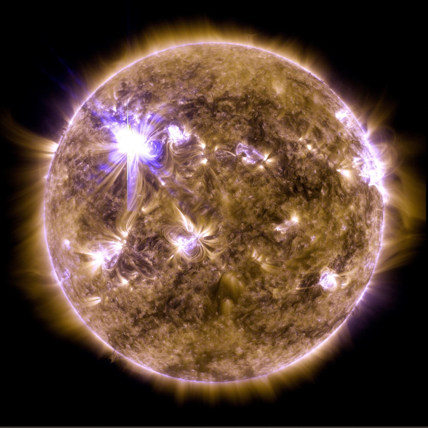 image: An X-class solar flare flashes on the edge of the Sun on March 7, 2012. This image was captured by NASA's Solar Dynamics Observatory and shows a type of light that is invisible to human eyes, called extreme ultraviolet light.
