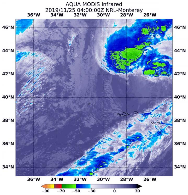 NASA's Aqua satellite passed over eastern North Atlantic Ocean and captured an infrared view of what is now Extra-tropical cyclone Sebastien. Sebastien transitioned from a tropical storm to an extra-tropical storm on Nov. 24. It has coupled with a cold front and is now headed for the United Kingdom.