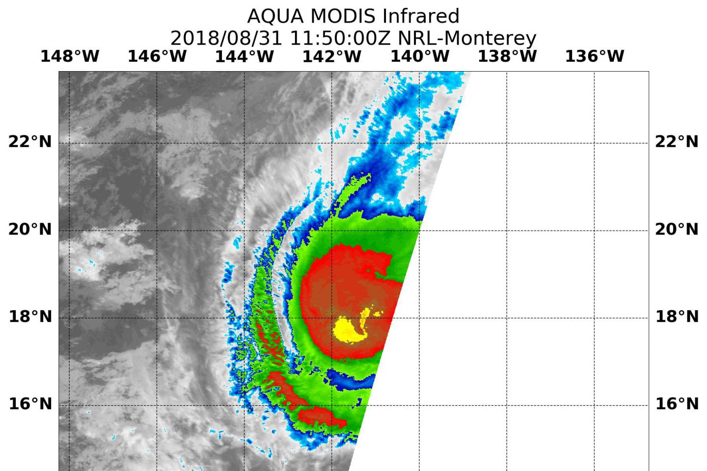 image: On Aug. 31 at 7:15 a.m. EDT (1150 UTC) NASA's Aqua satellite found the coldest temperatures of the strongest thunderstorms (yellow) in Hurricane Miriam were as cold as or colder than minus 80 degrees Fahrenheit (minus 62.2 Celsius) southwest of the center. They were embedded in a large area of storms (red) where cloud top temperatures were as cold as or colder than minus 70 degrees Fahrenheit (minus 56.6 degrees Celsius).