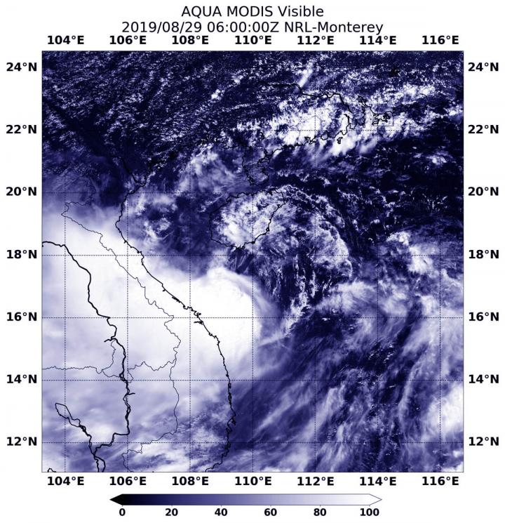 On Aug. 29, 2019 at 2 a.m. EDT (0600 UTC), the Moderate Resolution Imaging Spectroradiometer or MODIS instrument aboard NASA's Aqua satellite provided a visible image of Podul in the South China Sea. Podul had already started its landfall in central Vietnam and appeared somewhat elongated because northerly winds outside the storm are pushing clouds south of the center.