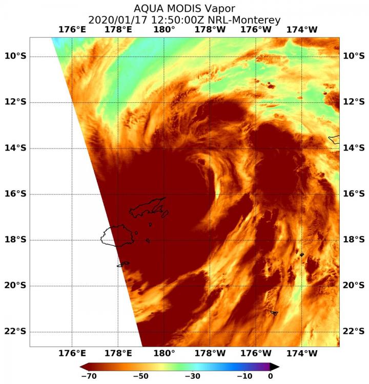 On Jan. 17 at 7:50 a.m. EST (12:50 UTC), the Moderate Resolution Imaging Spectroradiometer or MODIS instrument aboard NASA's Aqua satellite gathered water vapor content and temperature information on Tropical Storm Tino. The MODIS image showed highest concentrations of water vapor and coldest cloud top temperatures were around the center of circulation and over Fiji and surrounding islands. Coldest cloud top temperatures were as cold as or colder than minus 70 degrees Fahrenheit (minus 56.6 degrees Celsius) in those storms. Storms with cloud top temperatures that cold have the capability to produce heavy rainfall.