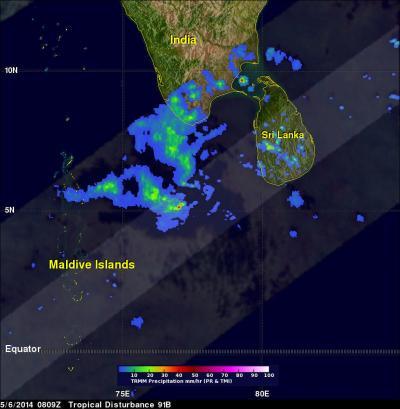 A tropical low was affecting southern India and Sri Lanka on May 6 at 0809 UTC when the Tropical Rainfall Measuring Mission satellite called TRMM flew above it. By May 7, System 91B moved over southwestern India and became less organized.
