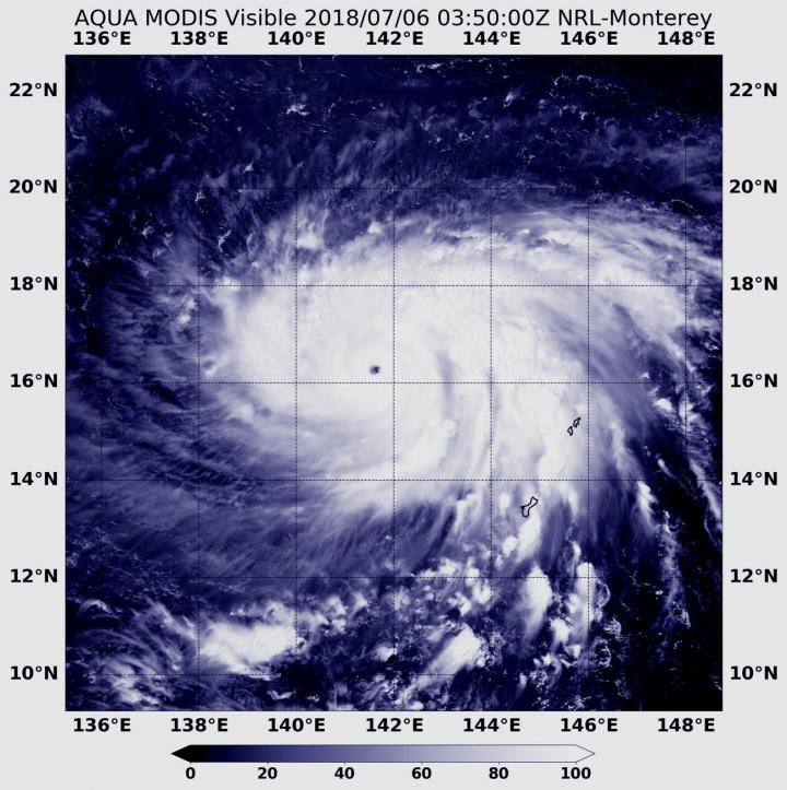 image: NASA's Aqua satellite passed over Super Typhoon Maria on July 6 at 0350 UTC (July 5 at 11:50 p.m. EDT). The MODIS instrument aboard provided an image that revealed a clear, small eye, surrounded by a powerful ring of strong thunderstorms.