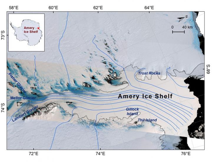 image: Satellite imagery of the Amery Ice Shelf in East Antarctica. The blue lines represent the movement of the ice as it flows from the continent to the edge of the ice shelf, where it calves, or breaks off into the ocean. Satellite data can now help researchers determine where these calving events will occur.