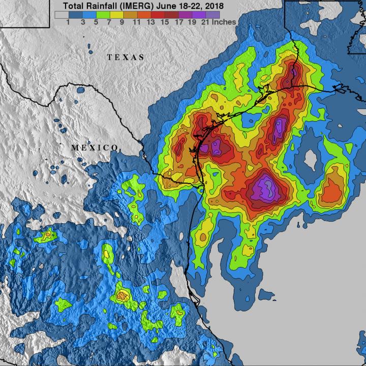 image: IMERG data shows extreme flooding in parts of Texas from low pressure tropical disturbance. IMERG estimates indicated that the heaviest rainfall occurred in the northwestern Gulf of Mexico where over 21 inches (533.4 mm) of rain fell. IMERG data also indicated that more than 9 inches (228.6 mm) fell in large areas from south Texas to western Louisiana. This extreme rainfall resulted in the worst Texas flooding since hurricane Harvey in August 2017.