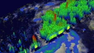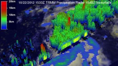 This flyby video was created from data when NASA's TRMM satellite flew over the developing tropical depression 18 on Oct. 21 at 8:40 p.m. EDT. This 3-D perspective showed powerful storms near the center were reaching altitudes of over 14 km (~8.7 miles). Red areas indicate heavy rainfall of 50 mm/2 inches per hour.