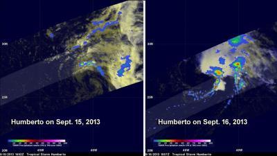 NASA's Tropical Rainfall Measuring Mission or TRMM satellite observed Humberto on September 15, 2013 at 1652 UTC (12:52 p.m. EDT) and on September 16, 2013 at 1557 UTC (11:57 a.m. EDT). A comparison of the two TRMM orbits showed significant changes that occurred within Humberto in less than 24 hours. In the first orbit on September 15, 2013 Humberto's center of circulation was rain free and only contained a small area of convective rainfall that was located well to the north of Humberto's surface location. Areas of strong convective rainfall were associated with rebounding Tropical Storm Humberto when TRMM viewed the same area on September 16, 2013.