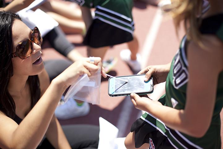 image: Taylor Hooks of Science Cheerleaders swabbing a cell phone at a 2013 Pop Warner youth cheerleading event in Coronado, Calif. Swabs from thousands of volunteers show that different communities of microbes -- some of them basically unknown to science -- thrive on shoes and cell phones.