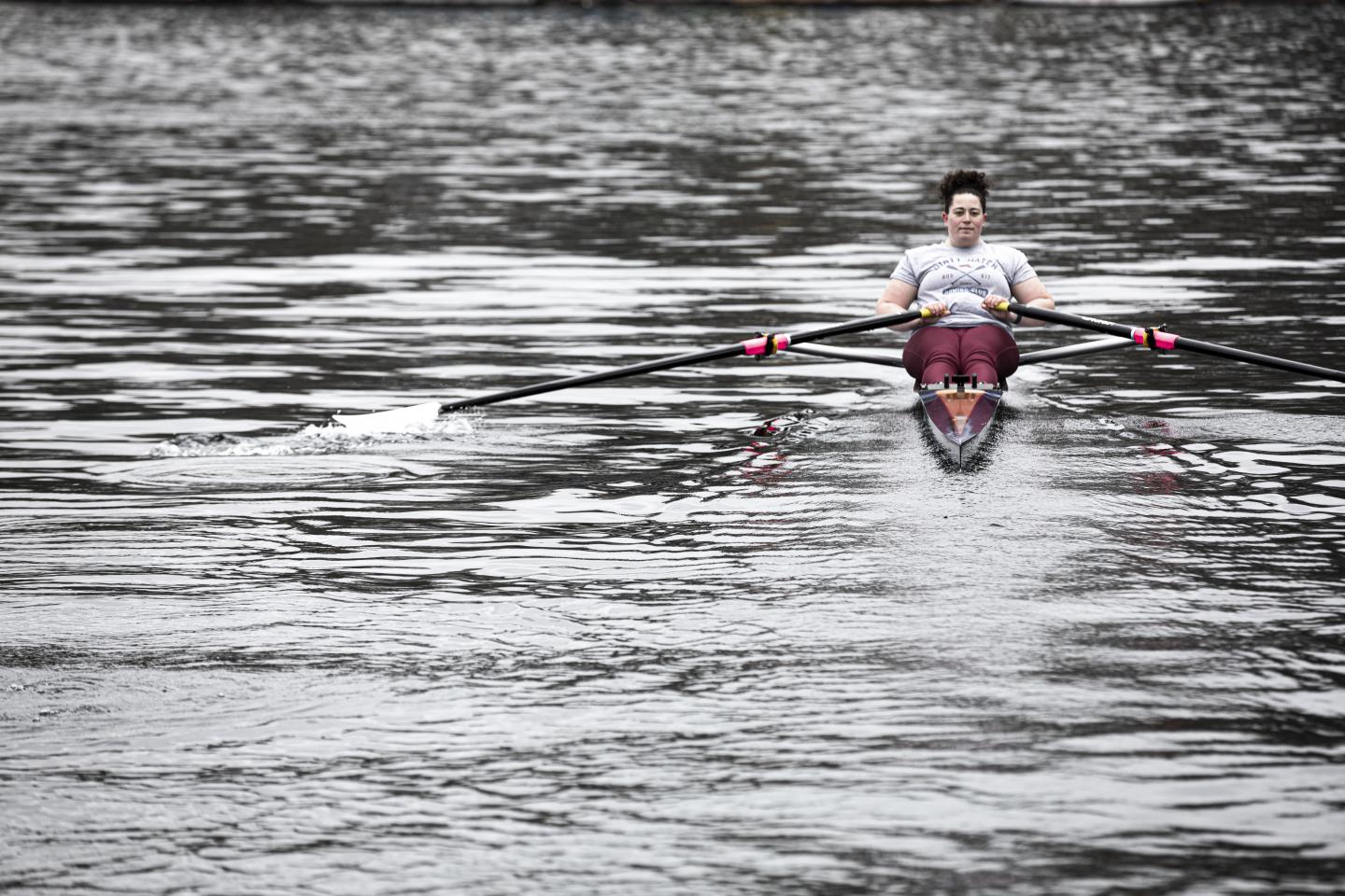 image: UW researchers interviewed 22 athletes and staff members from three college athletics programs to see how collecting data from college athletes might encroach on their autonomy. Lead author Samantha Kolovson, a UW doctoral student in human centered design and engineering, rowing on Lake Union in Seattle. Kolovson was on the rowing team as an undergraduate at the University of Massachusetts Amherst.
