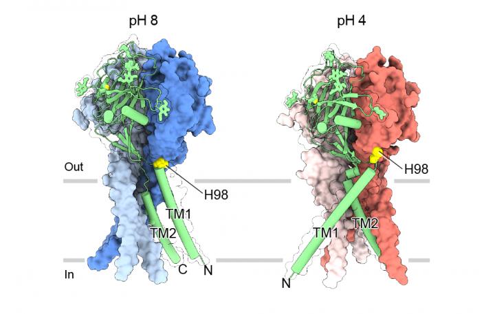 The images reveal a wedding bouquet-like structure, with parts that change configuration in response to environmental pH. When pH shifts from alkaline to acidic, a key pH sensor moves from its "resting" location and is inserted in an "acidic pocket," which signals that the gate allowing ions in and out of the cell should be open. This specific mechanism has never before been described.