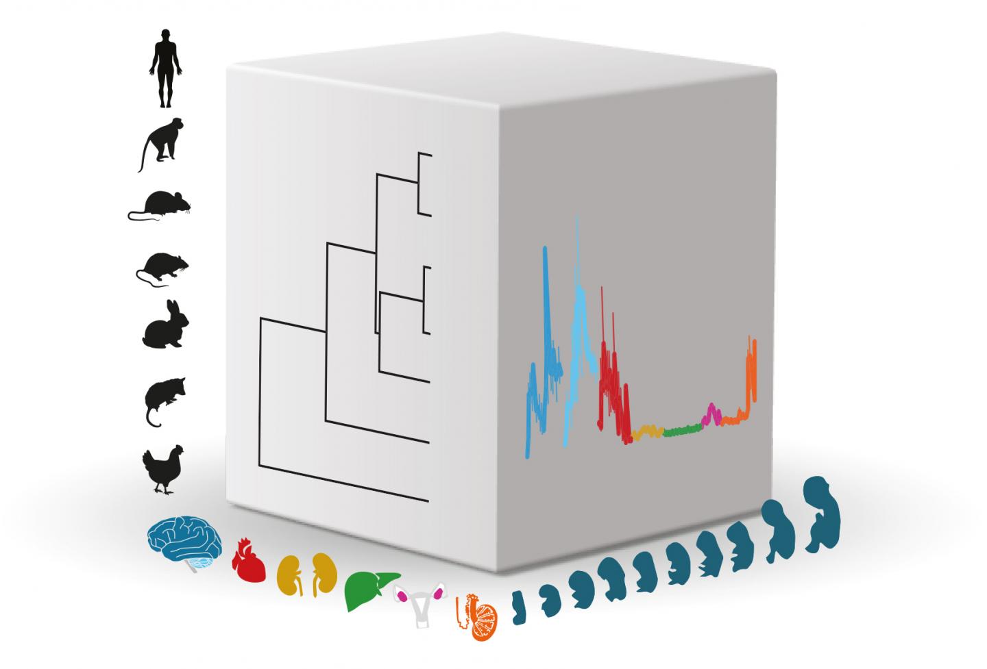 image: The research group of professor Dr. Henrik Kaessmann investigated the activity (expression) of genes across mammalian organ development. The figure (cube) illustrates the three main biological dimensions of the work: species, organs and developmental stages. The evolutionary relationships of species are indicated in a tree on the left frontal surface of the cube, while the expression of an exemplary gene across development in different organs is indicated on the right frontal surface.