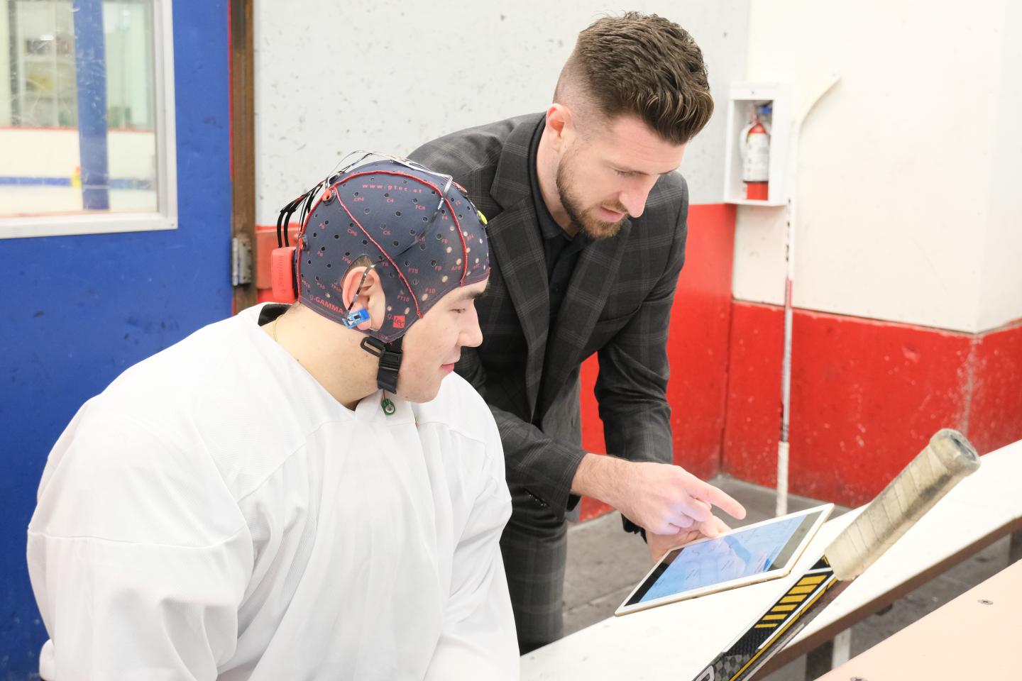 image: Hockey player gets his brain vital signs checked. Researchers find repetitive head impacts can result in functional brain impairments in youth hockey.