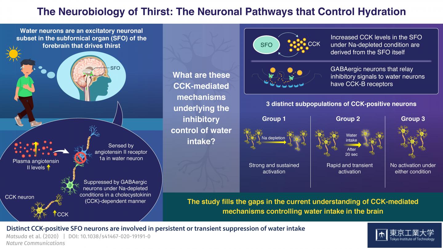 A team of researchers from Tokyo Institute of Technology, headed by Prof Masaharu Noda, have conducted extensive research into this. In their previous studies, they identified that thirst is driven by the so-called "water neurons" in the subfornical organ (SFO) of the brain, a region just outside the blood-brain barrier. When the body is dehydrated, the plasma levels of a peptide hormone called angiotensin II increase. These levels are detected by special angiotensin II "receptors" of water neurons to stimulate water intake. In turn, under sodium-depleted conditions (where there is more water than sodium), the activity of these water neurons is suppressed by "GABAergic" interneurons. "The latter control appeared to be dependent on the hormone cholecystokinin (CCK) in the SFO. However, the CCK-mediated neural mechanisms underlying the inhibitory control of water intake had not been elucidated so far," states Prof Noda.