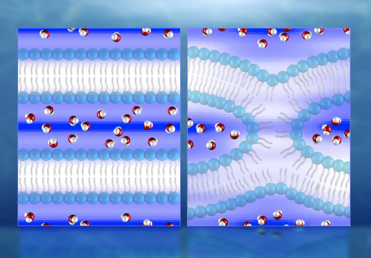 The researchers' water density map indicates the water dissociates from the lipid surfaces in the initial lamellar, or layered, phase. In the intermediate fusion phase, known as hemifusion, the water is significantly reduced and squeezed into pockets around a stalk--a highly curved lipid "bridge" connecting two membranes before fusion fully occurs.