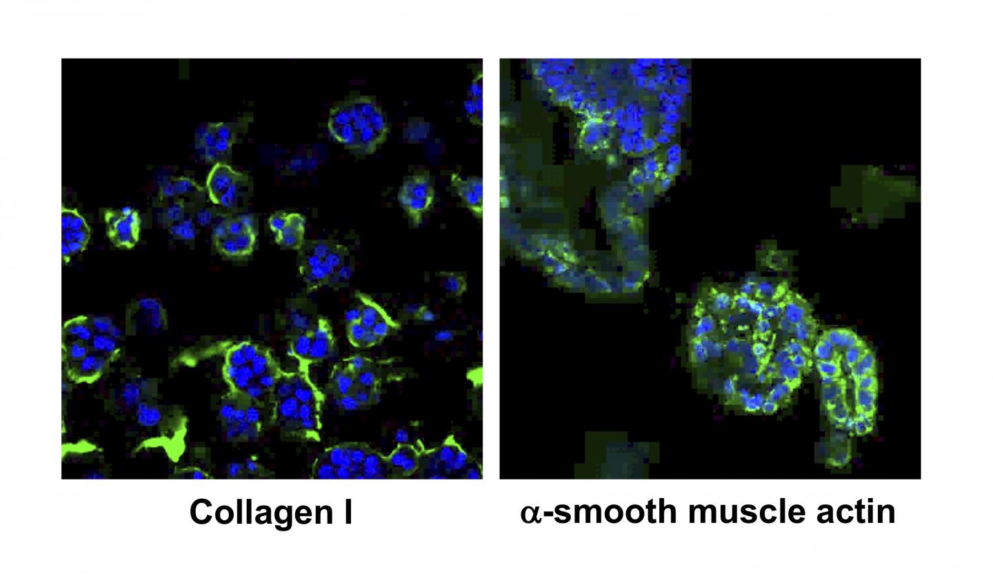 image: Left panel: Expression of Collagen I protein in green indicates that fibrosis, one of the NASH characters, is formed in the NASH organoids. DAPI staining in blue shows nuclie of cells.