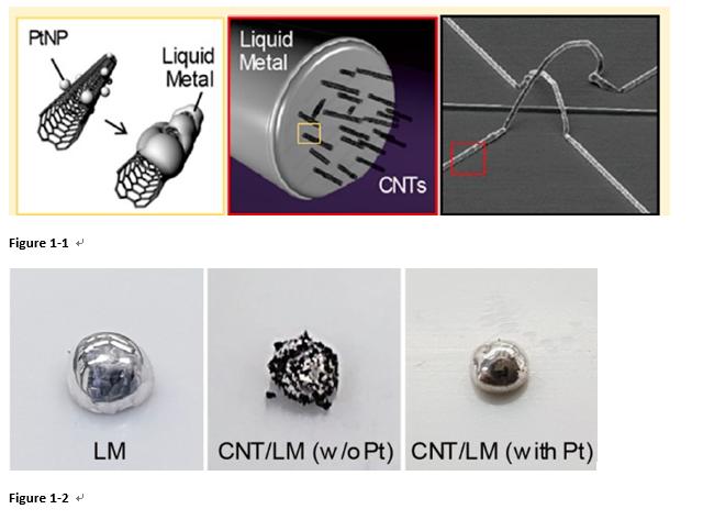 image: Figure 1-1 Graphical summary of the work. Carbon nanotubes with platinum (Pt) decoration shows high affinity with liquid metals (left), and it results in the uniform dispersion of carbon nanotubes in liquid metal, forming stretchable metal composite (middle). The stretchable metal composite has superior mechanical properties than pristine liquid metal, and thus fits to be patterned as consistently-fine (i.e. high resolution), 3D structures (right).