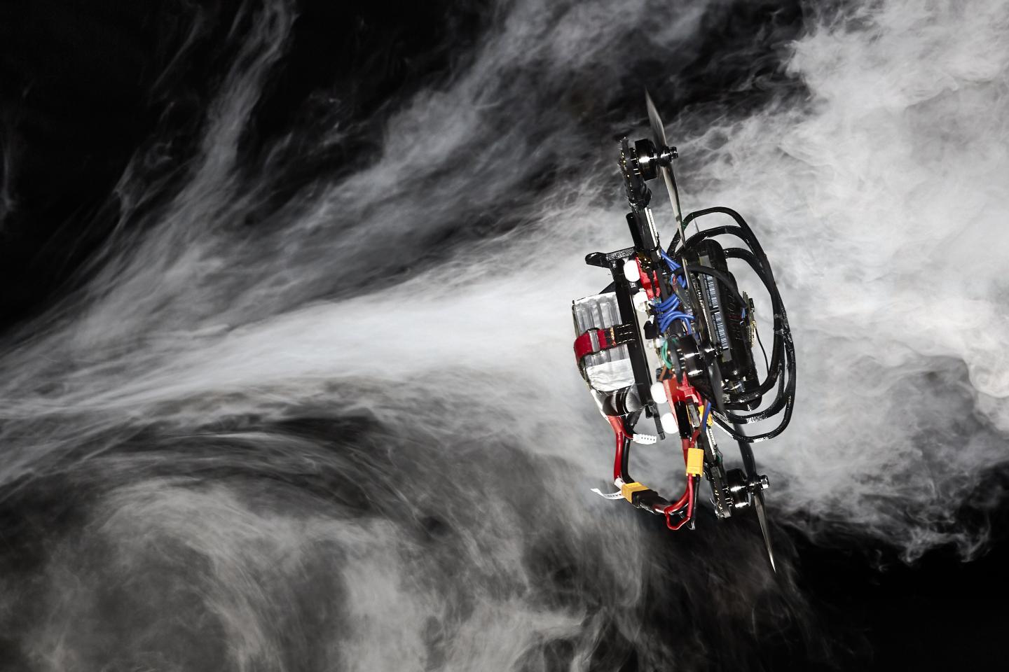 image: A drone flying through smoke to visualize the complex aerodynamic effects.