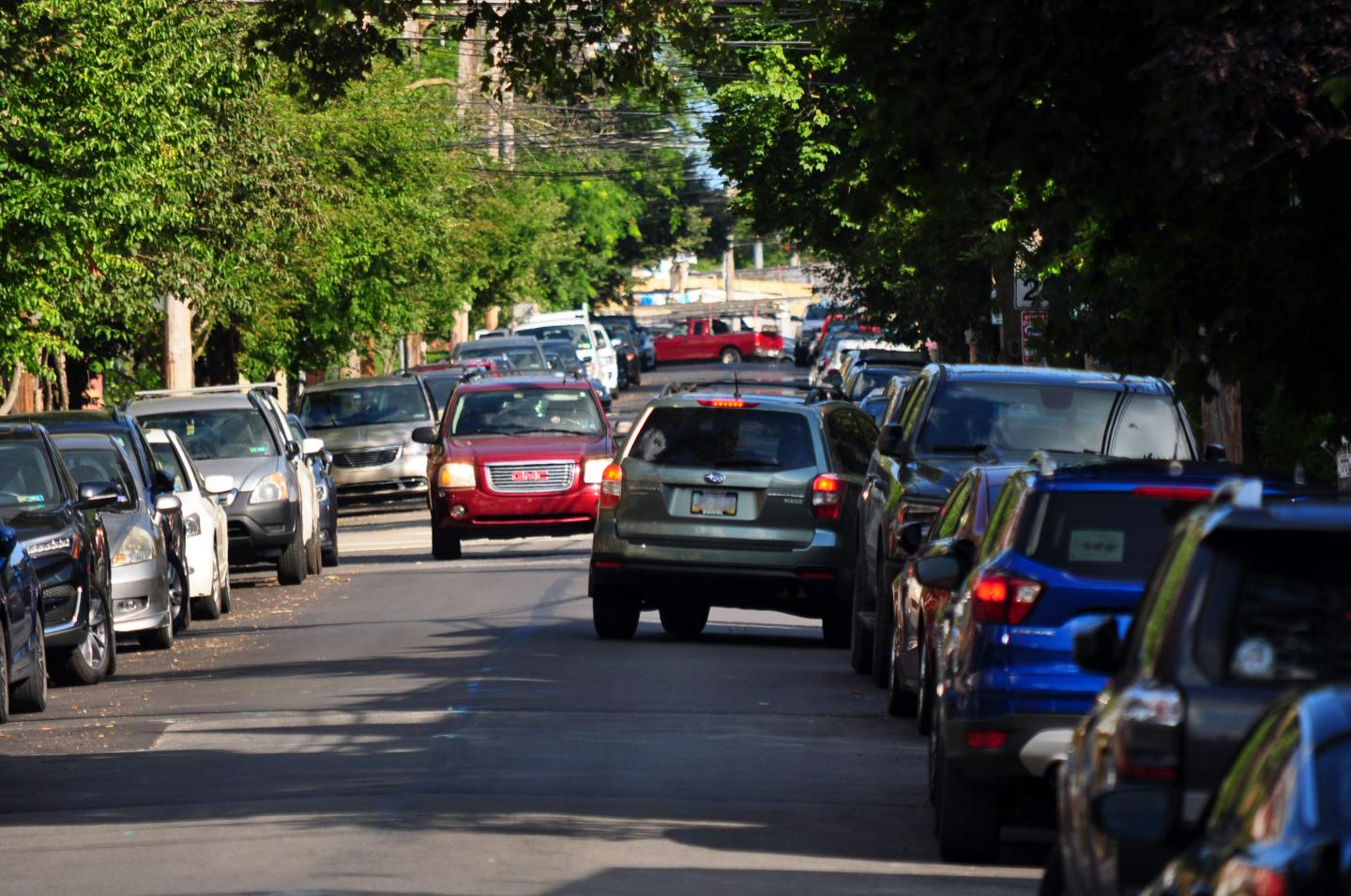image: Vehicles attempt to pass each other on a crowded street in Pittsburgh, Pa. Researchers at Carnegie Mellon University sought to enable autonomous vehicles to navigate this situation.