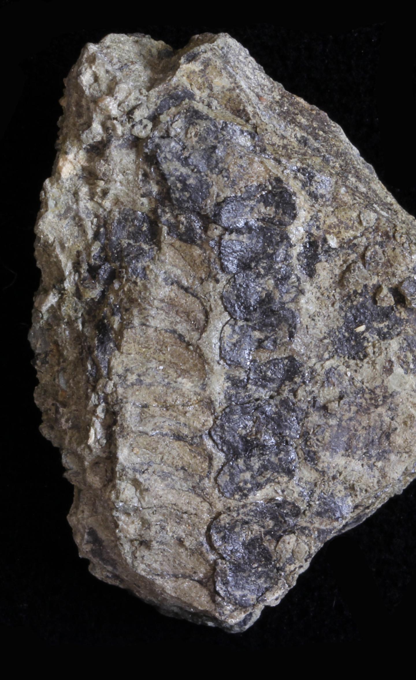image: In this image of one of the new ancient species' reproductive structures, elliptical impressions of sporangia can be seen in one row, while on the right, another row displays preserved carbonized spore masses.