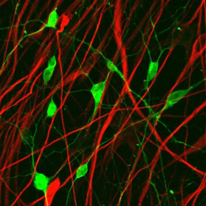 image: Glioma cell-converted neurons. Red cells are glioma cells; green cells are converted new neurons.