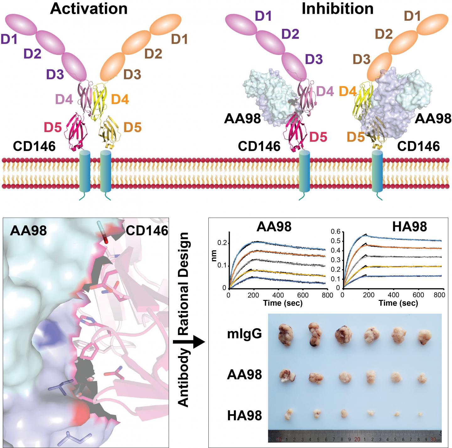 image: A higher affinity antibody HA98 was rationally designed based on the CD146/AA98 complex structure and showed better inhibitory effects on tumor growth. (Image by XIE Can)