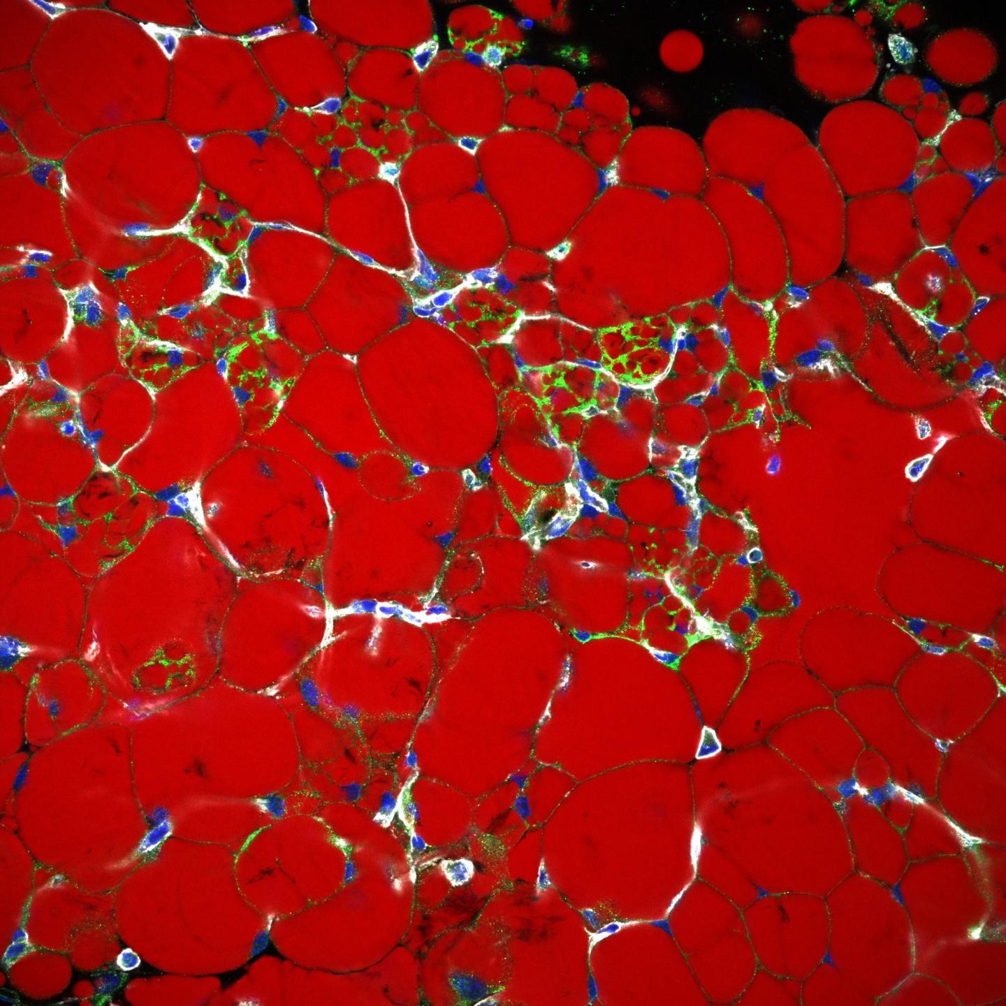 image: Beige adipocytes within white adipose tissue (beige adipocytes stained with UCP-1 in green. Lipids are stained in red and F-actin outlining cells especially blood vessels in grey, DNA ist blue)
