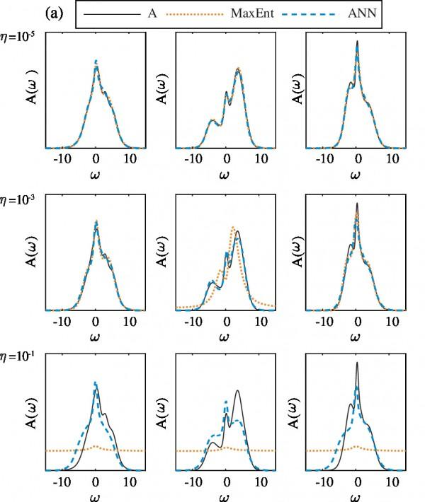 image: Comparison of the starting spectral functions A(ω) (solid lines) with the predicted A?(ω) calculated using the MaxEnt approach (orange dot dashed lines) and the proposed ANN model (blue dashed lines) at different noise levels η for three examples of spectral density functions not present in the training dataset. ANN behaviors as good as MaxEnt at low level of noise but behaviors much better than MaxEnt at high level of noise.