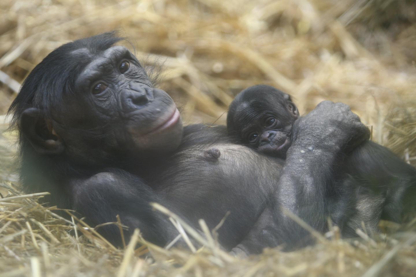 image:Â Mhudiblu, a female bonobo, holds her daughter Akema. Mhudiblu's DNA was sequenced to help construct a new, high-quality bonobo genome assembly for great ape and other hominid evolution and genetic research
