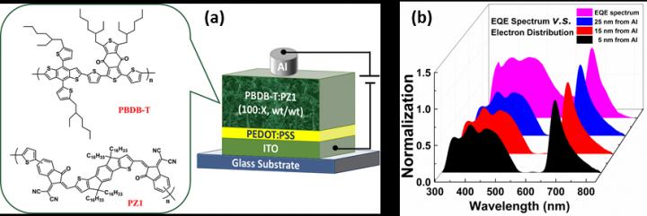 image: (a) The chemical structures of active layer components and the device configuration diagram of the PM type all-PPDs; (b) the normalized photogenerated electron distribution on different cross-sections (5, 15 and 25 nm away from the Al electrode) and the normalized EQE spectrum of PM type all-PPDs.