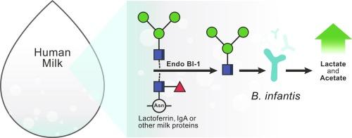 B. infantis is an infant-adapted gut bacterium uniquely capable of dominating the infant gut during exclusive breastfeeding, mainly through the well documented utilization of free human milk oligosaccharides (HMO). This key infant gut symbiont has been shown to create a protective environment in the infant gut during the early months of life via pathogen suppression, resulting in reduced virulence factors, a decreased abundance of antibiotic resistance genes, and reductions in colonic mucin degradation (1-4). These new data show that B. infantis is also capable of selectively releasing protein bound N-glycans from human milk glycoproteins in vivo. N-glycans from lactoferrin, in particular, are known to contribute to the antimicrobial activity of this protein and other glycans released by this enzyme may play an additional role in supporting the growth of B. infantis EVC001 in vivo.