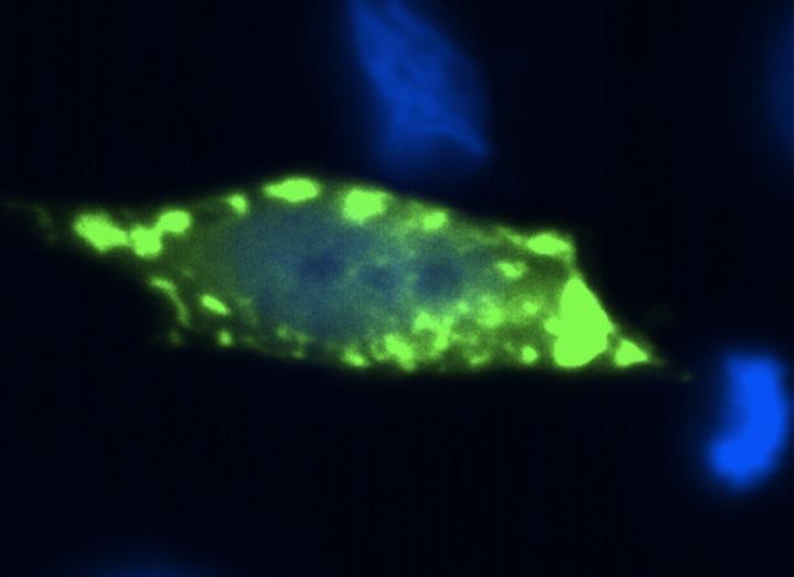 image: These are human cells producing aggregates of the protein Sod1 (in green).