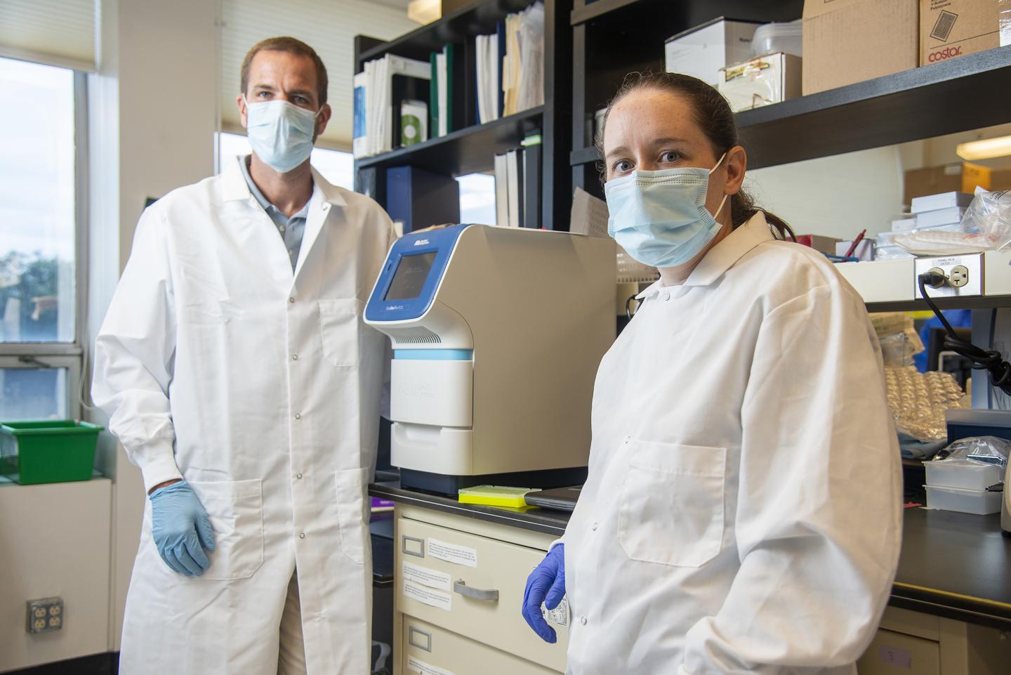 image: Jason Botten and Emily Bruce, who pioneered a streamlined COVID-19 test that doesn't use scarce chemicals, in their research lab in the University of Vermont's Larner College of Medicine. The machine between them is used to measure the presence and quantity of viral RNA in patient samples.