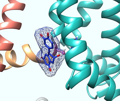 image: Structural model showing the tea flavonoid epicatechin gallate (blue/red) binding to the base of the voltage sensor (green) of KCNQ5, a type of potassium channel found in human blood vessels.