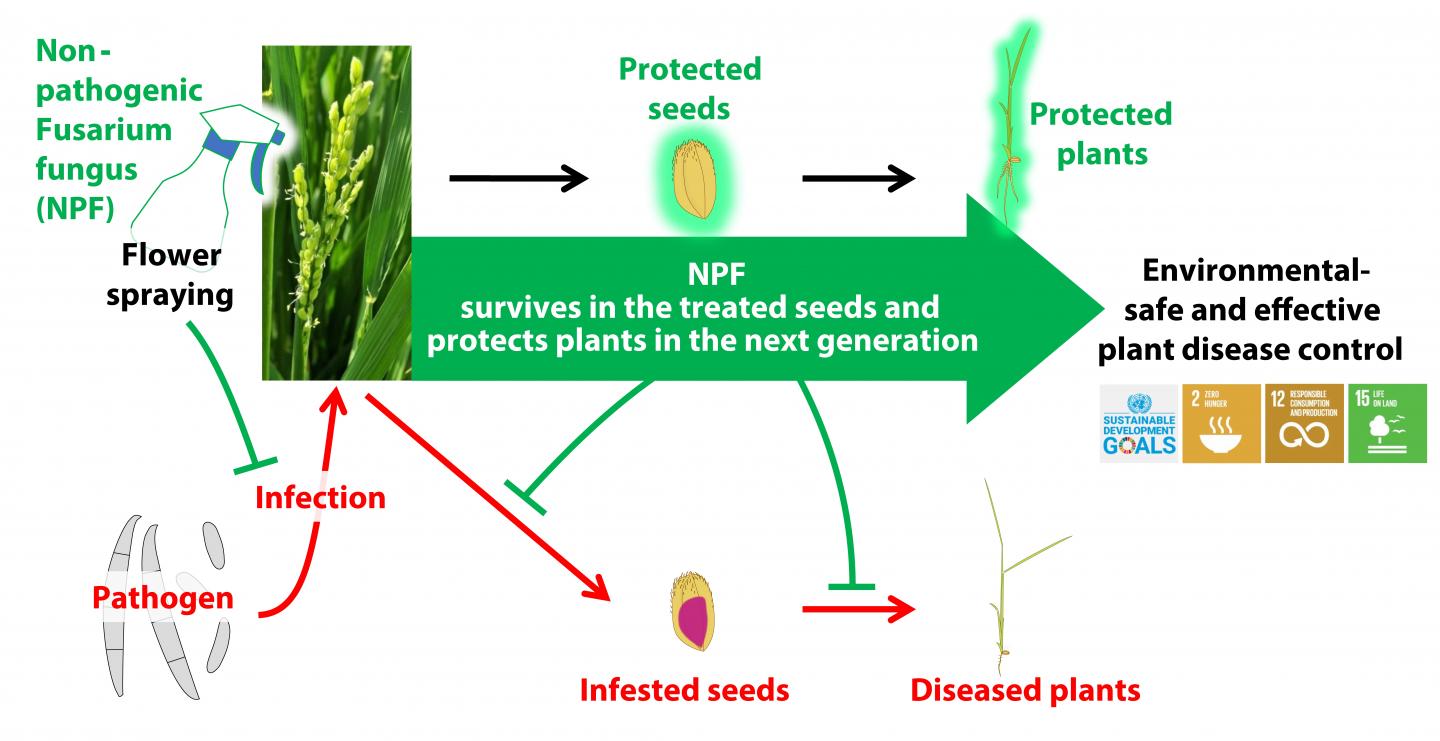 The new biocontrol technique, developed by plant pathologists at Tokyo University of Agriculture and Technology, involves spraying rice flowers with a non-pathogenic strain of the fusaria fungus and produces rice seeds carrying the non-pathogenic fusaria. Testing against conventional techniques showed roughly the same level of effectiveness, both against transmission of the disease to seeds, but also transmission among offsprings.