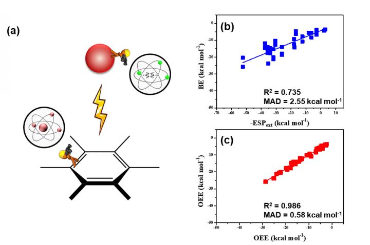 image: (a) Schematic presentation of the 'Orbital Electrostatic Energy (OEE)'. The binding energies (BE) of the BF4--π complexes plotted versus (b) the extrema of the electrostatic potential surface above the center of the arene ring with molecular electron density being rendered at the 0.001 a.u. (ESPext) and (c) the orbital electrostatic energy (OEE).