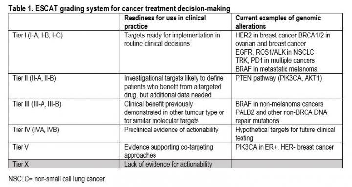 As ESMO disseminates ESCAT into clinical practice, it is hoped that cancer centres and laboratories will start to routinely include Tier I-V grading of genomic mutations in patients' clinical and laboratory reports and discuss results at tumour boards and clinics.